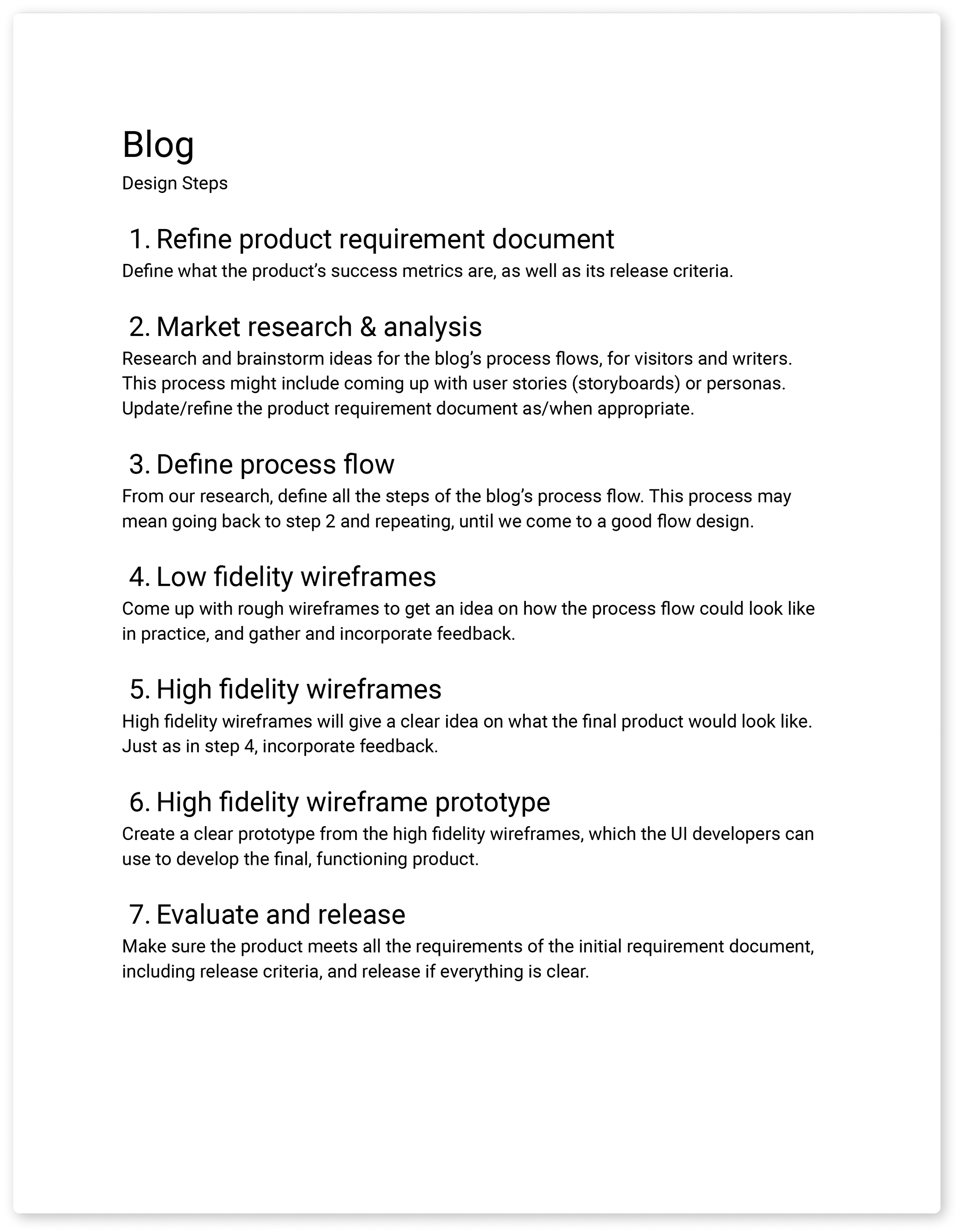 Break down the overall design process for the blog into a series of concrete research/design steps.