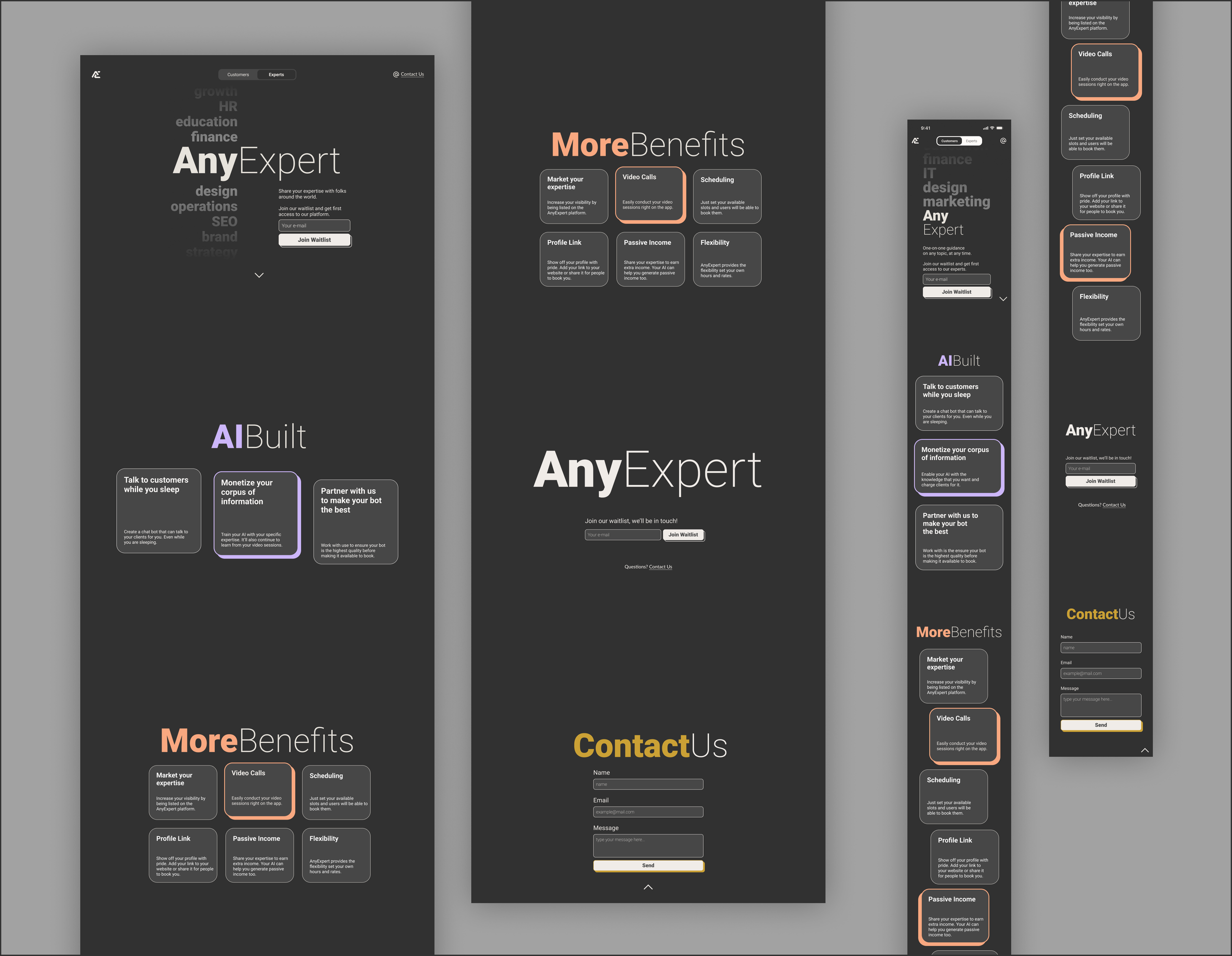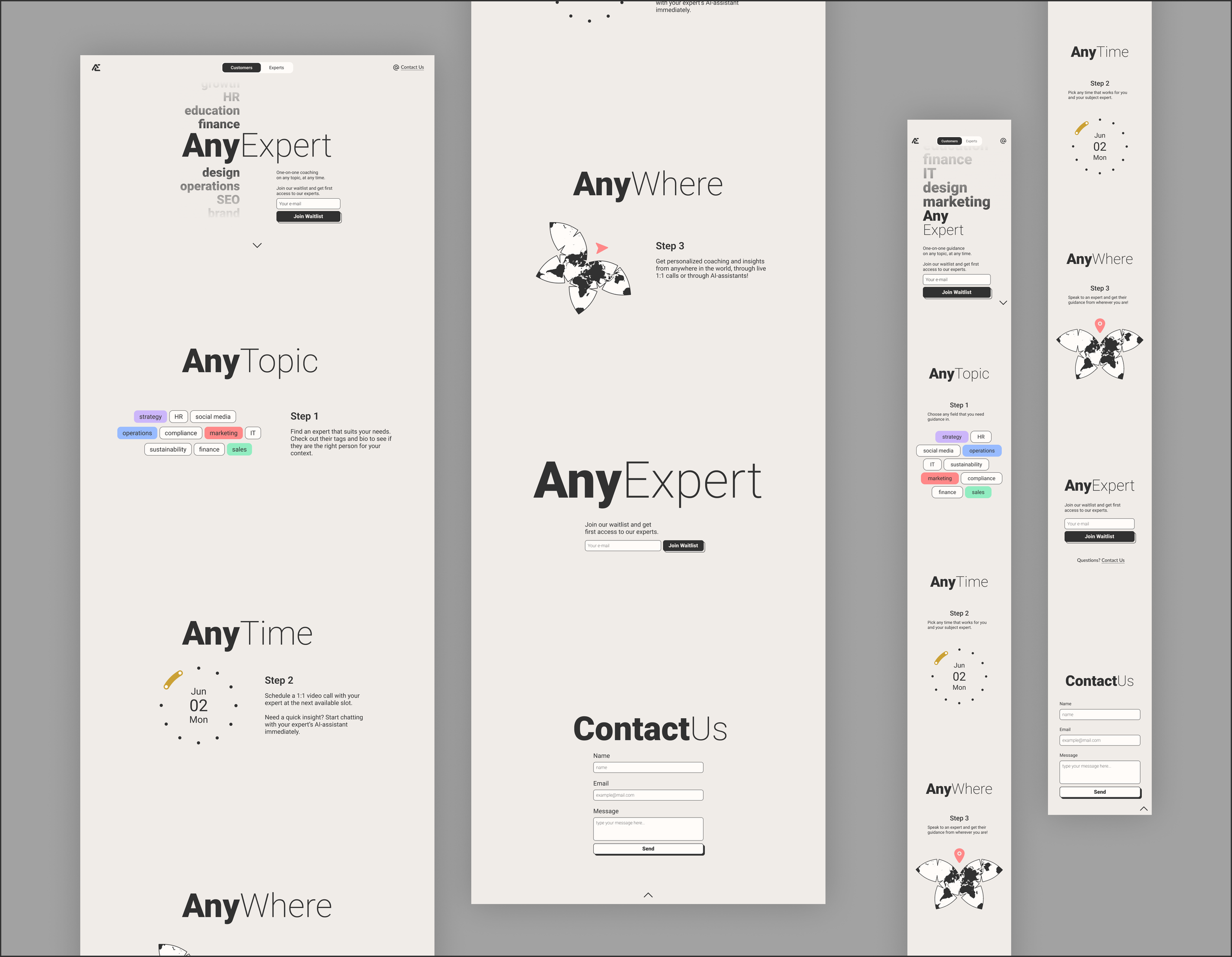 As web designer, I worked closely with the founder, to establish the company’s online presence, the primary goal being to inform visitors and draw them to sign up for the product wait-list. I was responsible for the company’s landing page, seen below. Because visitors to the landing page will generally fall under one of two categories, mentees and experts, we designed two different landing pages. A tab selector just below the website header allows visitors to switch between the two.