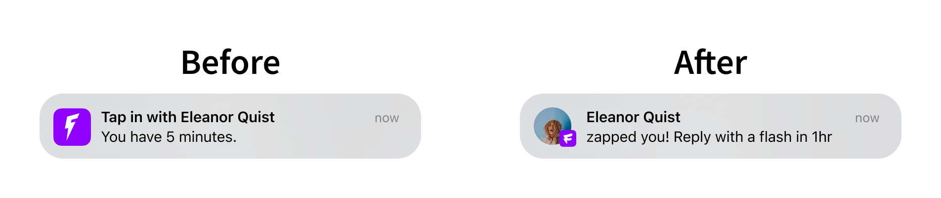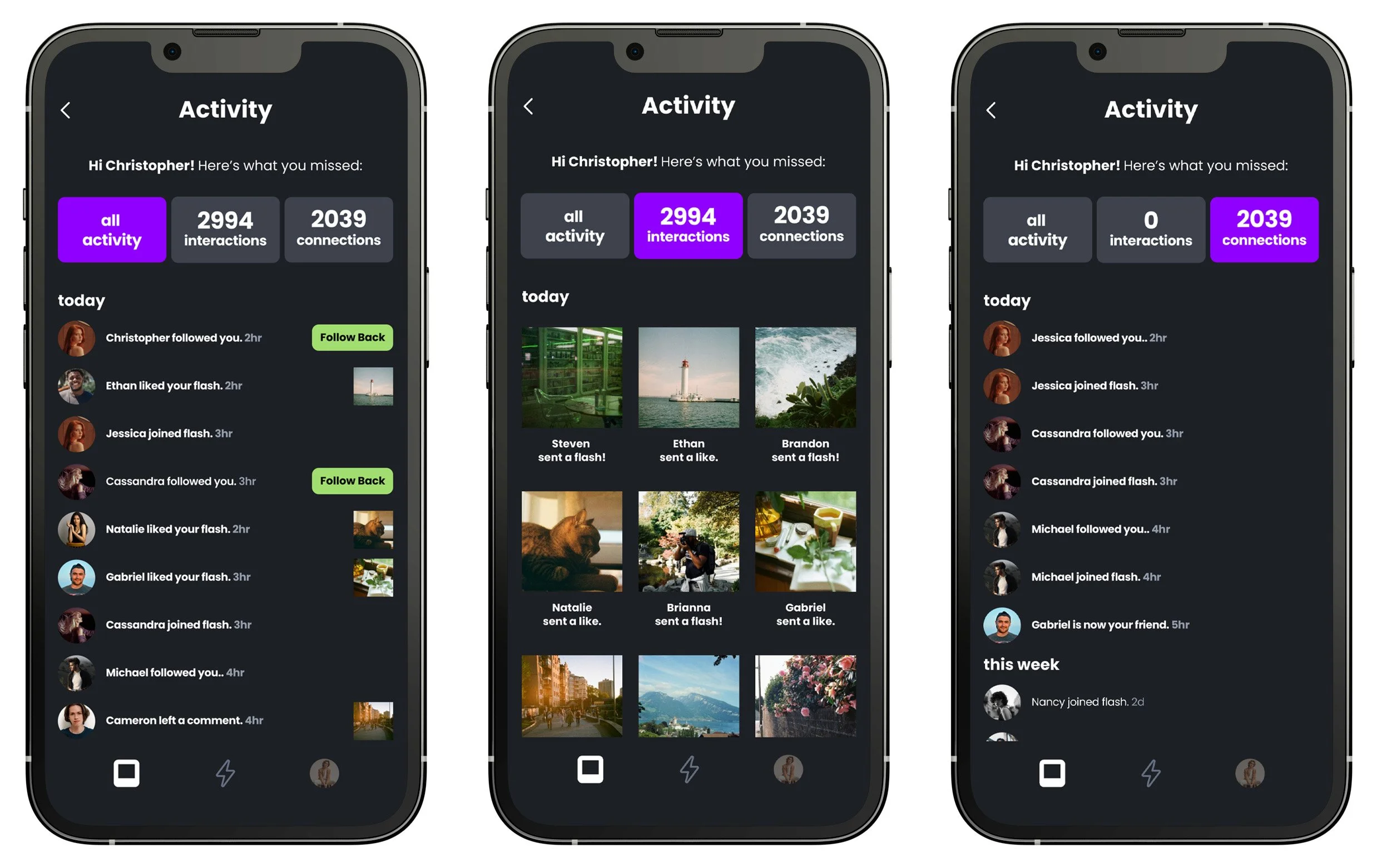 We found that Flash’s spontaneous interactions resemble instant film photography. Our goal was to create a unique experience that blends analog and digital elements through personalized posts that mimic instant film. We maintained familiar social media conventions like comments, notifications, and friend invites while adding our standout feature: the zap page, where users can prompt others to send an instant photo (i.e: a "flash").